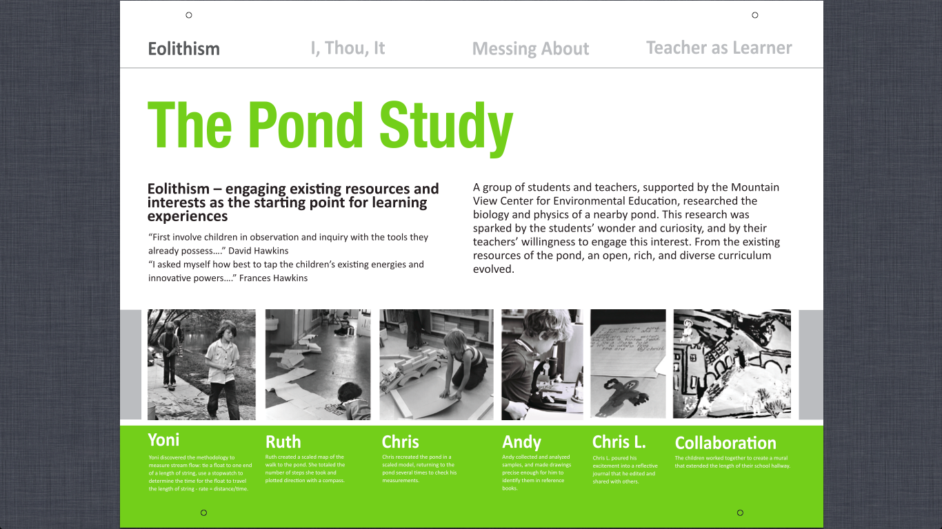 There is so much to play with in outdoor natural environments. There is so much that encourages messing about from leaves, to sticks, twigs, rocks and logs. It is an opportunity to use existing resources as a starting point for learning experiences. This is where to begin with what Hawkins referred to as “Eolithism” a big idea that came to life during the magical Pond Study illustrated in the wonderful exhibit – Cultivate the Scientist in Every Child: The Philosophy of Frances and David Hawkins.