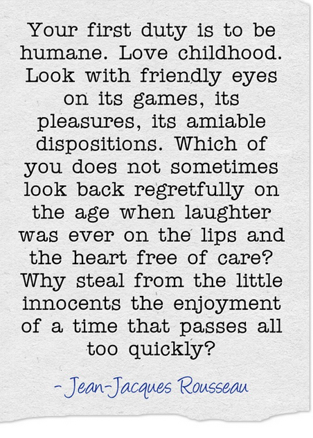 I am currently reading Giants in the Nursery: A Biographical History of Developmentally Appropriate Practice by David Elkind the author of The Hurried Child and The Power of Play and I am reminded that Elkind’s work is reflected in the words of Rousseau who addressed the issue of forcing children to grow up too quickly. Rousseau warned against premature instruction and was a proponent of focusing upon children’s interests: