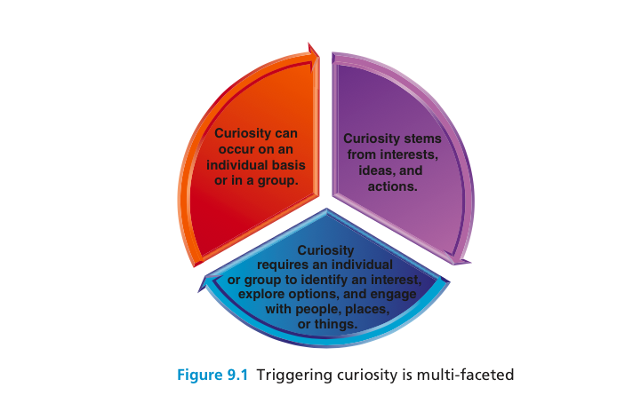 This lead to a search about quotes on creativity to share on Facebook and during the process I am reflecting on practice and theory. Somehow the tangle of spaghetti that has become my brain begins to branch off and it makes a connection to a recent blog post from Debi Keyte-Hartland, another colleague who gets my brain going in all sorts of directions. Ultimately, I go back to an article that speaks to me in profound ways about the inspiration to learn written by Peter Moss. Moss speaks to the work of the educators from Reggio Emilia who see learning as “a process of constructing meaning” and knowledge “in the words of Reggio’s co-founder Loris Malaguzzi, is like a ‘tangle of spaghetti’ with no beginning, middle or end, but always shooting off in new directions” (Moss, 2005, p. 26). My thoughts migrate to the work of my critical friend and co-author, Beverlie Dietze on curiosity. I am wondering about the connection between curiosity and creativity and I am helped by this graphic that Beverlie created that appears on page 206 of our new textbook, Empowering Pedagogy for Early Childhood Education (Dietze & Kashin, 2016).