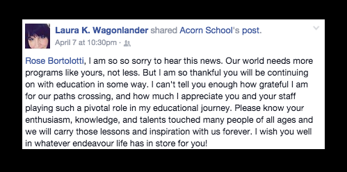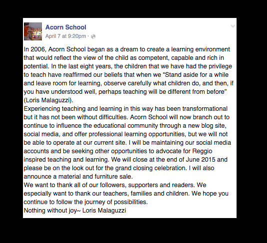 I am very sad to hear that Acorn School is closing. I attended the Summer Institute last year and was hoping to attend more with my daughter who is an ECE. It was a fabulous experience and the beginning of my learning journey of the Reggio approach. Rosalba and the team offered a wonderful opportunity to experience joy and wonder. Best of luck in the future!
