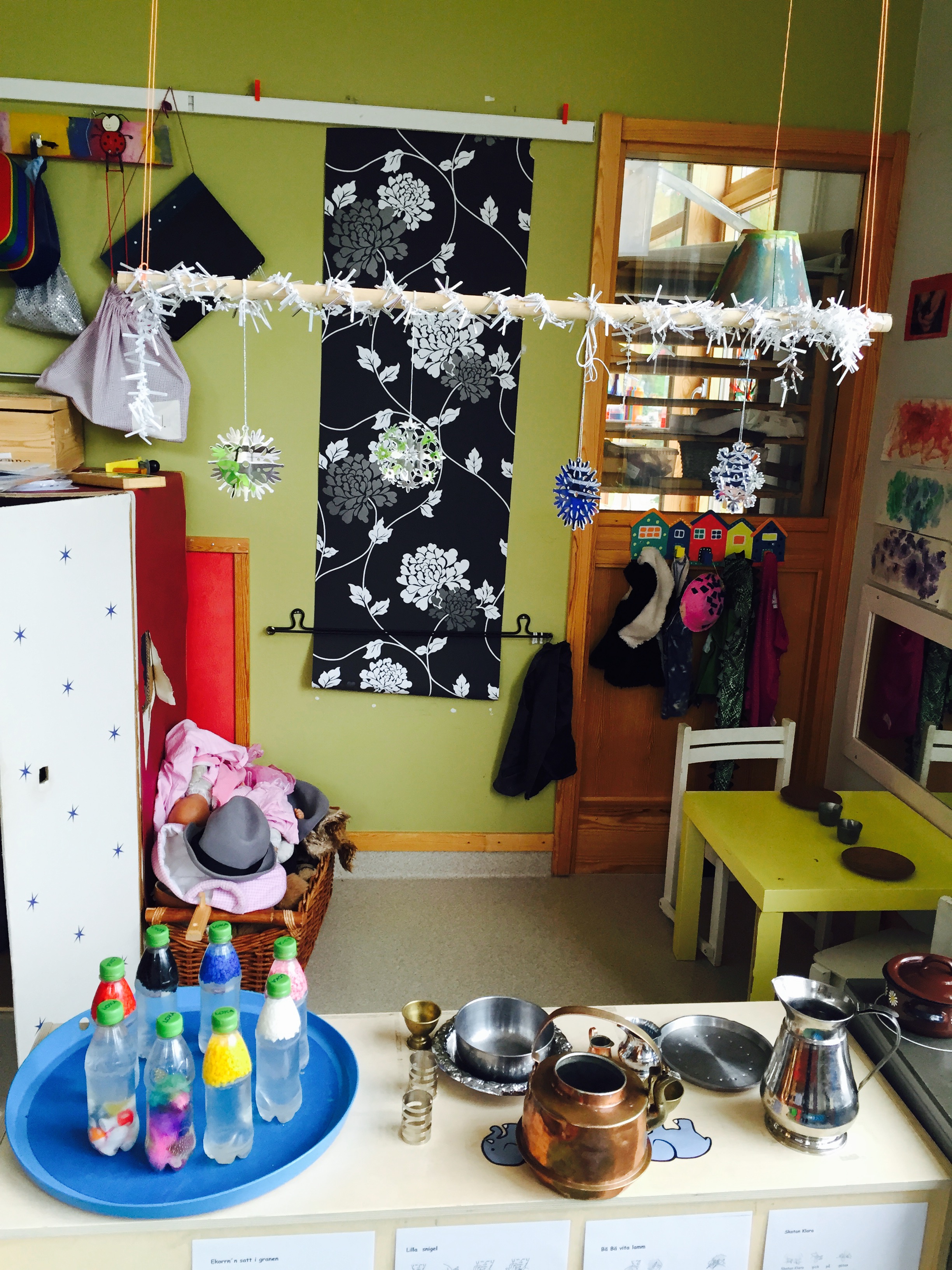 So what struck me as different when I was in Uppsala? I was amazed at the response I got when I asked the question, “where do the children sleep” and the door opened to an outdoor area. I was told that this is where the children sleep everyday. Another thing that struck me as different was that the teachers ate with the children and the food was delicious. At Suzanne’s centre everything is sugar free and this lead to a dialogue with Suzanne about the ritual of birthday celebrations. Instead of sweet laden treats brought in by the parents or supplied by the centre, a flag was hung in the school each morning that a birthday would be celebrated. The child whose birthday it was would take a special trip to the grocery store which was across the square from the location of the preschool to choose three different types of fruits which were then arranged on a three tier platter to be shared with their group. In Uppsala, I was told by one of the teachers showing Suzanne and I around that food is not used to celebrate birthdays but the practice is that the child gets gifted by a special activity on their special day. At Eddukens in Uppsala the food was not sugar free but rather low in sugar. I am thankful for that because I so enjoyed the slightly sweetened lingonberry sauce that I had with the “cabbage pudding” served that day. When I talked to Suzanne about the menu at Filosofiska I was amazed to learn that the fixed menu of one day fish, one day meat and three days vegetarian was based on their belief in sustainable practices. I am sorry I couldn’t have been with the children this past week to have the experience of tasting reindeer stew!