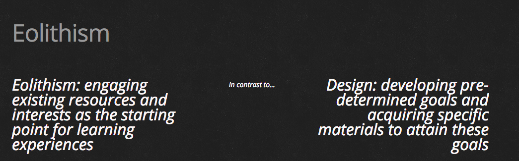 With inspiration from Frances and David Hawkins and the big idea of eolithism that supports that learning should be gained from using existing interests and resources without a rigid agenda we sought to provide an experience for the participants to learn at their own pace and in their own way.