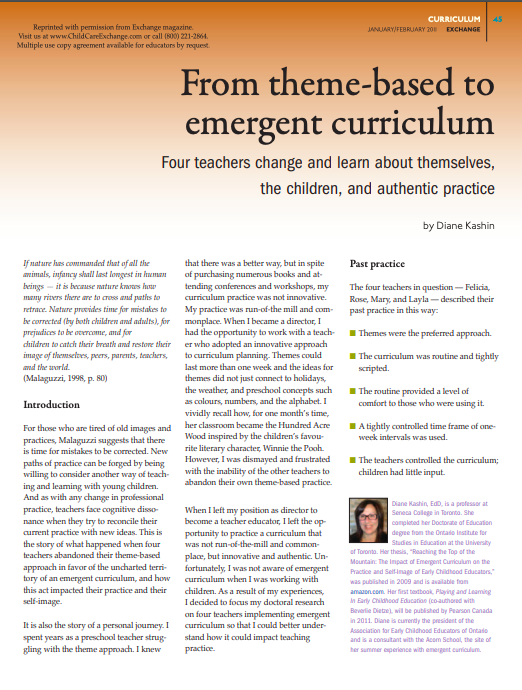 When we first heard of this innovative approach to early childhood education that began in Italy shortly after the Second World War, we were curious and excited. Based on the theories of social constructivism and focused on a pedagogy that supports an emerging curriculum, long-term investigations are a key feature of the approach. I (Diane) remember being at a session for early childhood education faculty in Ontario in the very early nineties where I first heard about the place that is called Reggio Emilia and the principles of the Reggio Emilia Approach. It was overwhelming to learn about this complex philosophy and when someone in the audience suggested that it was not realistic in our contexts, the presenter recommended the Project Approach. I immediately went off and purchased the book by Katz and Chard and began teaching my students about emergent curriculum and expecting them in their placements to focus on projects with the children. Later, I wondered whether, I had supported the creation of long-term themes and worried about the structure of the Project Approach and whether it focused too much on topics (nouns) rather than ideas (verbs). This became a musing in my doctoral dissertation, and I wrote about it in an article published in Exchange in 2011.
