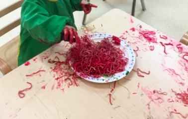 I think about my grandson and how much he loves playing with water on the tuff tray I got from Scholar’s Choice. He pours and stirs. He offers a cup of “tea” to others. The set-up is simple. The experience is complex. I know there is a great debate in our profession about the use of food in play. I want to believe in the capacity of educators to reconsider the use of food as sensory materials on moral and ethical grounds. I believe we need to think more deeply about sensory play and avoid the lure of the pretty images but celebrate the messes instead! I also think we can go beyond the cooked spaghetti even if it is messy!
