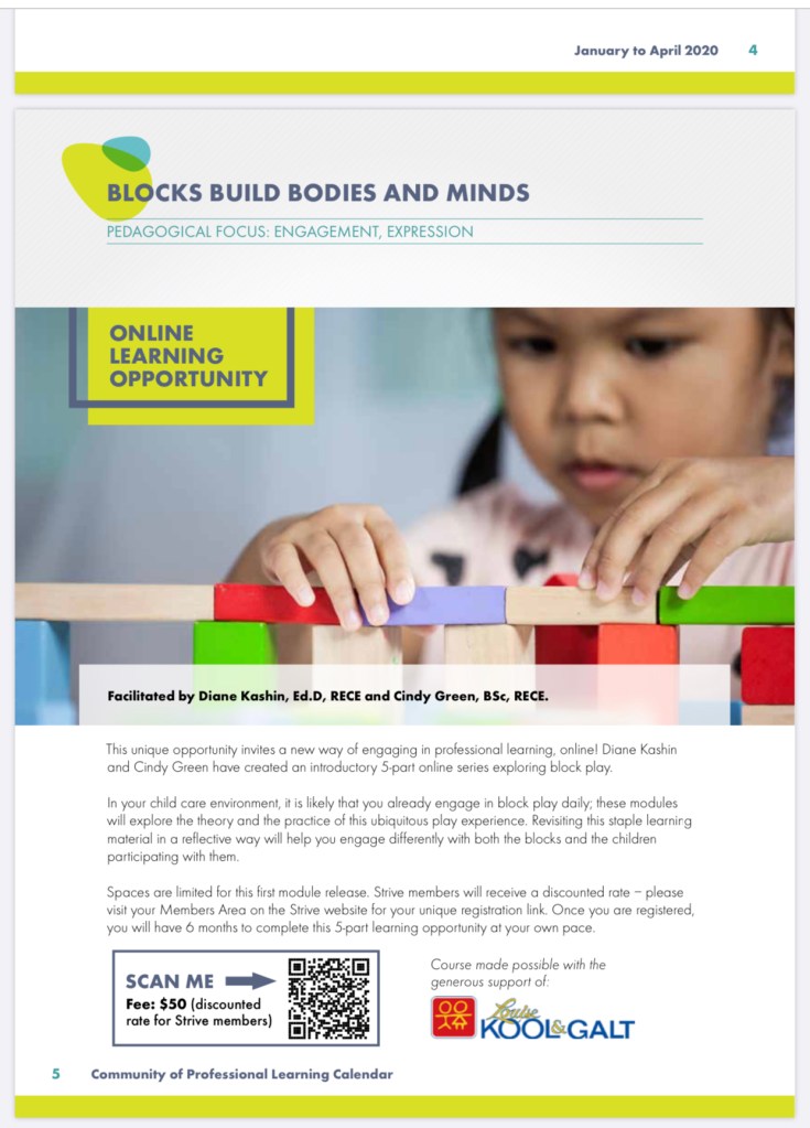 We would like to invite you to experience, Blocks Build Bodies and Minds. This online professional learning module will provide you with the theory and the practice of blocks play! You will be able to engage with other colleagues taking the course as you bring the joy of blocks to children!