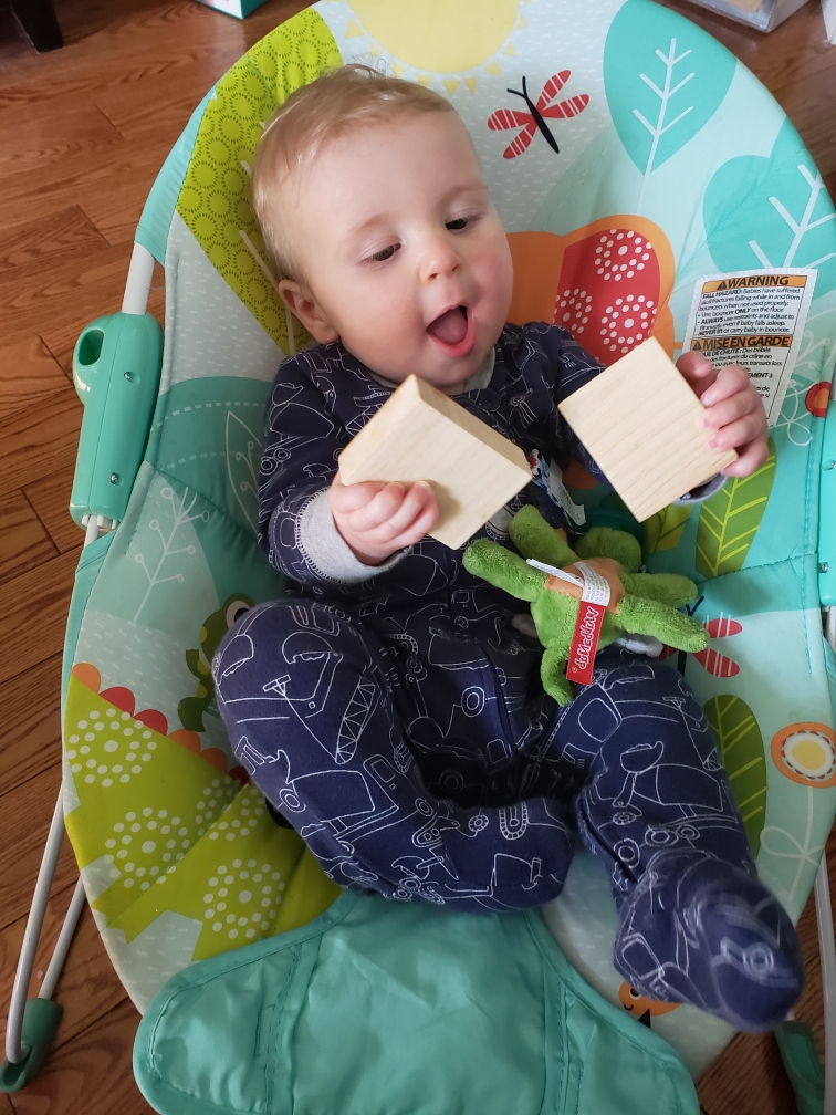 Recently, I chuckled when my son had me on speaker phone, and Griffen asked me. “Are you playing with blocks, Bubbie?” Perhaps if Cindy was over for a visit, I would have said, “Yes!” as we have been known to play with blocks together, on more than one occasion. I (Cindy), have taken great delight in watching how my great nephew Derrick is engaging with blocks. As an infant, he is taking interest and learning to navigate materials within his surroundings. In addition to mouthing the blocks, holding on to palm-sized blocks and banging them together is a current play interest.