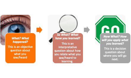 John Dewey highlighted that reflection in a learning context is not just a passive recall of an event. Reflection is a deliberate and active process. It is about thinking to learn. When we observe children, thinking about what is meaningful about what we see takes us from the what (the objective) to the so what and now what. Donald Schön built on Dewey’s work and linked reflection more solidly to professional learning and professional practice. By using critical reflection, we gain new understandings that improve practice. When we employ the type of reflection that Schön identified as reflection in action, which is essentially ‘thinking on your feet’ we are learning to look for the deeper meaning in our practice. Let’s say, you have provided a concrete experience for children to engage in and documented that experience in real time. Using Rolfe et al’s (2001) reflective model: What? So what? Now what? can bring you to a point of critical reflection as indicated in this diagram.