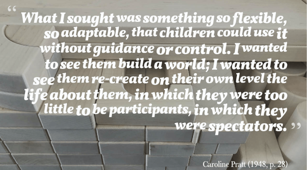We have been inspired by following #blockplay on Twitter and Instagram and engaging with educators taking the block play module. We hope to see you there! Meanwhile, we conclude with the words of Caroline Pratt. While written a century ago, these still resonate today.