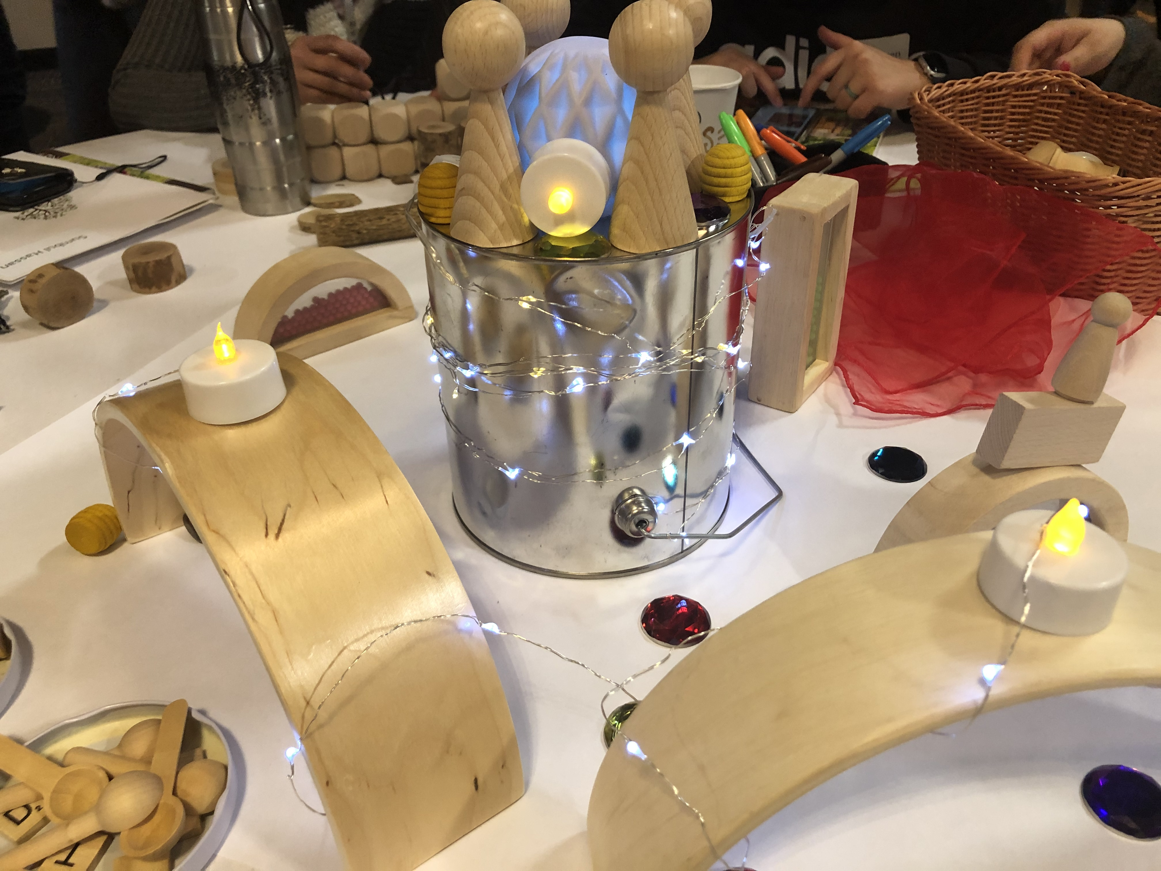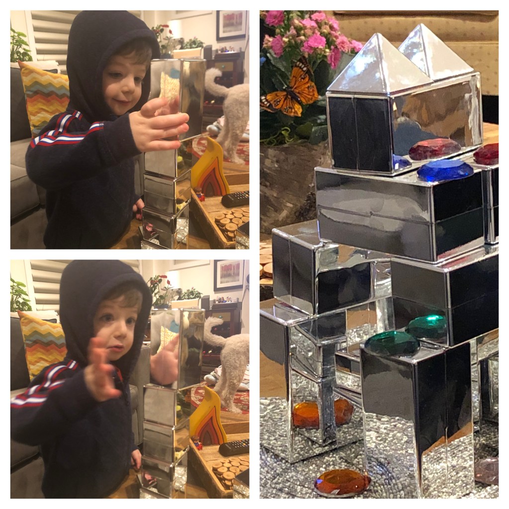 What  kinds of blocks have you encountered and are they represented by the 10 types? We would love your input! What new and novel blocks are inspiring block play in your settings? Please comment below or join us on Twitter (Diane and Cindy) and share photos using the hashtag #blockplay. Or post on Instagram (Diane and Cindy)! We love images of children and blocks! Recently, I (Diane) was gifted a set of Metallic Mini Blocks from Canadian Classroom. These amazing blocks are reflective and my grandson, Griffen loves them!