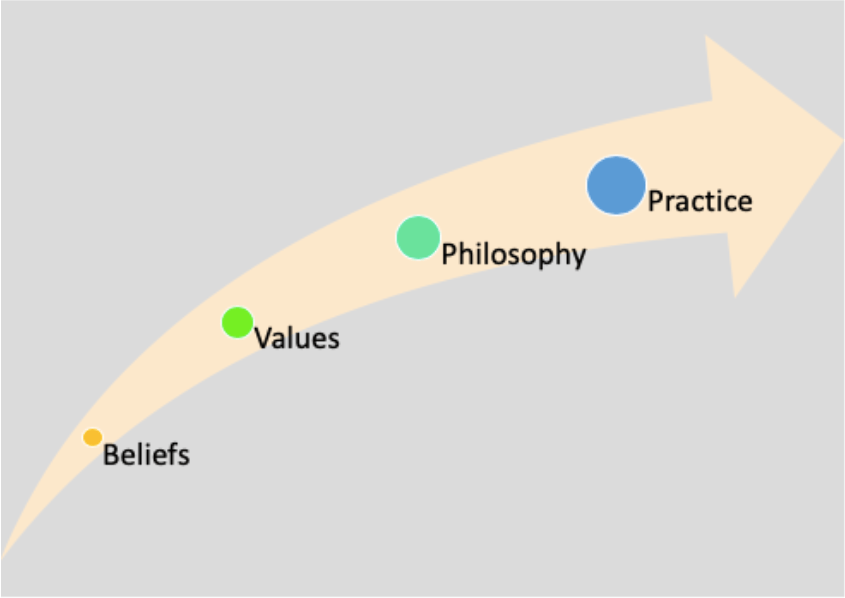 In unpacking the pedagogical approach that asks us to consider ourselves as co-learners, it is important to consider pedagogy as an umbrella term that covers a wide range of concepts belonging to the broad category of teaching and learning in the early years. How Does Learning Happen? is “intended to support pedagogy and curriculum/program development in early years programs” (Ontario Ministry of Education, 2014, p. 4). Pedagogy is a term that “may be unfamiliar to some in early years settings” (Ontario Ministry of Education, 2014, p. 4). It includes your philosophy and what you do in practice as it relates to your method of teaching and the content of what you teach (curriculum). In my experience, teaching early childhood education students and now working with early childhood educators, philosophy is not everyone’s favourite topic. To examine educators as co-learners, requires reflection on the philosophy that underpins this pedagogical approach. That philosophy is constructivism, specifically social constructivism or co-constructivism. However, the term philosophy is like the term pedagogy – often used but not necessarily understood. Jones and Shelton (2011) define philosophy as “a personal clarification and articulation of your educational beliefs and values. You define yourself by it; your practice reflects it” (p. 66). It all sounds complicated. To simplify the process of understanding philosophy as it applies to early learning is to ask yourself this basic question, “how do children learn”? Then it basically comes down to a choice between two philosophical contrasting philosophies, constructivism/progressivism or behaviourism/instructivism. Do you believe children learn from constructing their own knowledge or are you the keeper of the knowledge and believe that children learn through being instructed? Answering this question, requires an examination of values and beliefs. Values are stable long-lasting beliefs about what is important. A belief will develop into a value when there is a commitment to it. Your values and beliefs should be reflected in your philosophy. Values and beliefs become the foundation of practice.