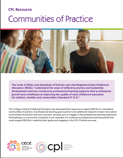 I really appreciate this view of a continuous process that is not a “one-off” activity. It is imperative that you have ongoing opportunities to listen and learn from others. Early childhood education communities of practice (CoPs) are a vehicle to support ongoing collaborative inquiry. Communities of practice are groups of people who share a concern or a passion for something they do and learn how to do it better as they interact regularly (Wenger, 2011). Do you have a CoP? Do you want one? This resource from Ontario’s College of Early Childhood Educators will help!