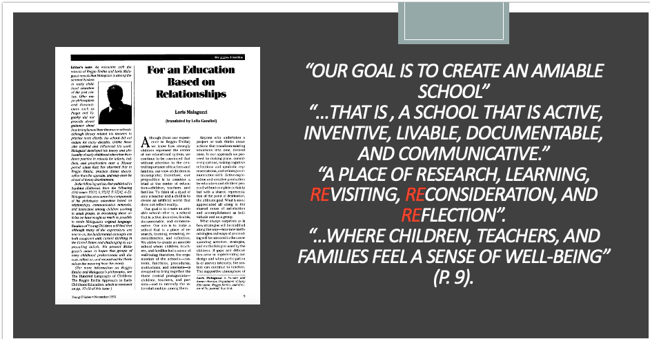 The goal was to create an amiable school. This is what we want in these challenging times for children, teachers and families. I have re-read the article, For an Education Based on Relationships by Loris Malaguzzi many times in the last four months. Each time it has given me pause to reflect and remember. The Reggio Emilia Approach is my touchstone. In my years of teaching early childhood education, I was tasked with the responsibility of introducing the approach to my students. In that capacity I was instrumental in bringing the college where I worked into a partnership which brought “The Hundred Languages of Children” exhibit to Toronto from October 2006 to March 2007. Being able to share the exhibit with students and colleagues is an experience that has stayed with me. Yet, it is not enough to just revisit memories. I am revisiting words that I first read when initially engaging with the approach that transformed my practice. I am revisiting now to reset. I am re-reading words that I now find to be extremely profound and prophetic. Malaguzzi (1993) speaks to strategies needing to be modified along the way, to suppress distance between people in support of relationships based on openness and democracy. These words ring as true now as they did then.