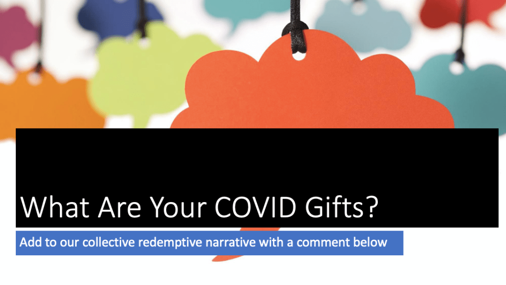 For the readers of this blog, I invite you to share your COVID gifts whether they be personal or professional or a combination of both! By commenting below we can create a collective redemptive narrative that amplifies the voices of those working in the early years sector. We can do it! We are doing it! We got this!