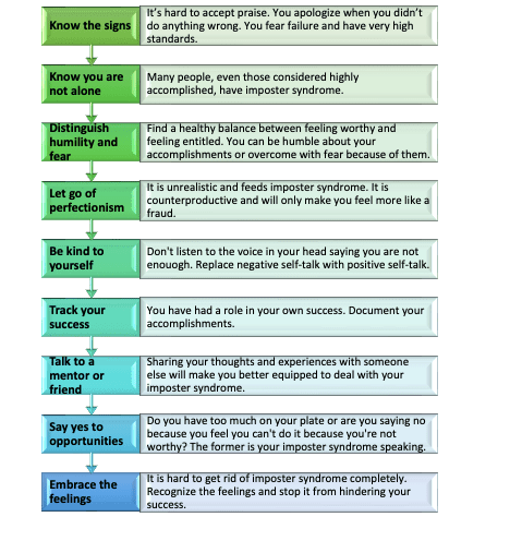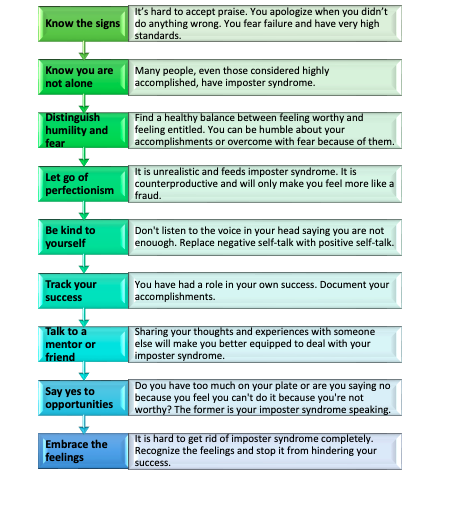 I know it is not uncommon to question memories, experiences, and knowledge instead of trusting ourselves. This is self-doubt and you may doubt yourself more than others do. If you have difficulty trusting yourself, you may be living in a state of doubt where it is easier to believe in others than in yourself. This year, I am resolutely going to cultivate self-awareness and foster self-trust. How about you? When you accept your feelings and work toward understanding them better, you will be more able to trust. The persistent fear of being exposed as a fraud is often associated with higher rates of burnout, job dissatisfaction, and stagnancy. We don’t want that in 2023! Professional friends who share their fears about their job success, have an important sounding board and ally. According to Flora (2016), the term is actually a misnomer as it’s not a syndrome. There’s no disorder, no diagnosis, no cure. A more accurate term would be imposter phenomenon. Some very successful people experience feelings of not being worthy of praise or their success. It is often associated with overachievement and perfectionism. If you can relate to the feeling of being a fraud, know that you are in good company. Know that the key to coping with imposter syndrome is communication. Share with your professional friends. You and your friends may be relieved to find out that you are not alone. Author Lindsay Kolowich Cox (2020) offers these nine strategies to cope with imposter syndrome: