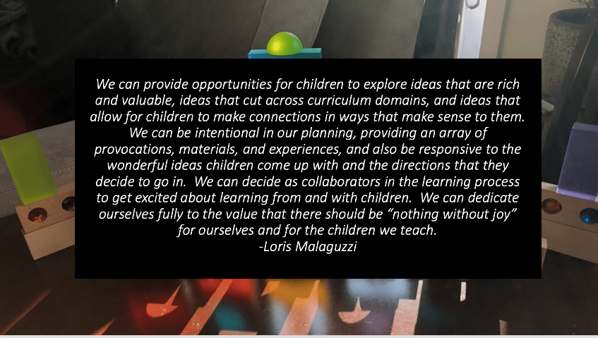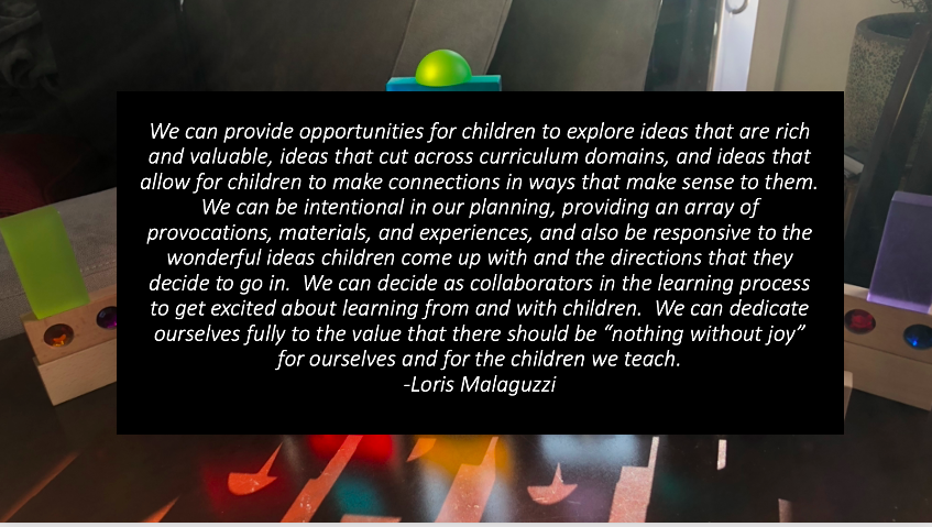 BIG IDEAS support thinking and learning. BIG IDEAS are rich and valuable. BIG IDEAS cross all curriculum domains. BIG IDEAS help children make connections in ways that make sense to them. BIG IDEAS support responsive and intentional planning. No wonder, BIG IDEAS are so big. In searching online for BIG IDEAS in early childhood education, I came across this rich and valuable resource that references Loris Malaguzzi’s thoughts on ideas.