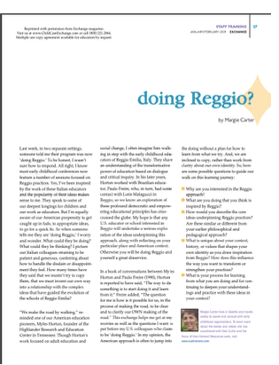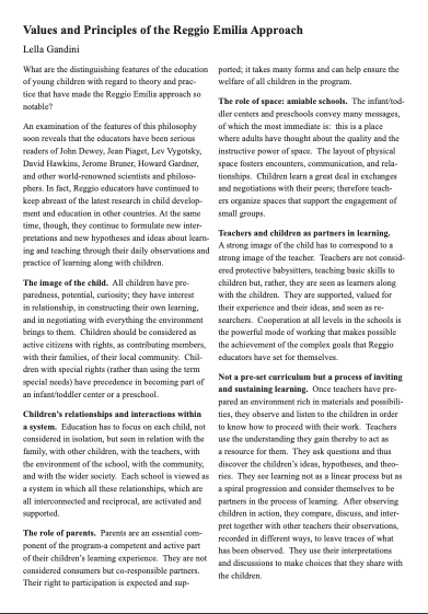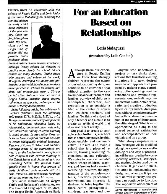 Aside from my time in Reggio Emilia, one of the greatest experiences of my professional life was when I had the privilege of spending time with Lella Gandini, the North American liaison for the Reggio Emilia Approach. In fact, when she was visiting a few schools here in Ontario, I got to be her driver! This article by Lella, focuses on the values and the principles of the approach. This should be required reading for anyone interested in examining the philosophy that underpins the approach. For all the articles in this blog, if you click on the images, you will be taken to the source.