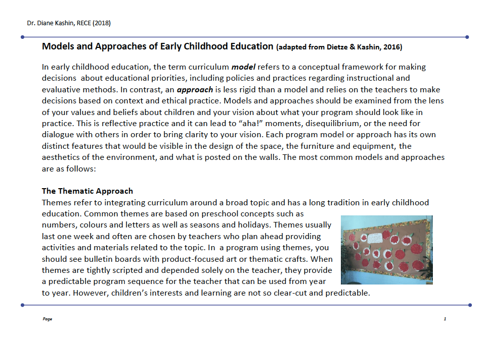 I hope that this page helps to increase understanding about this complex approach to early learning. There is a lot of misunderstanding out there! Reggio Emilia is a place. It is not a person. The Reggio Emilia Approach has reached celebrity status and finds itself considered along other brand names models/approaches such as Montessori, Waldorf and High Scope (New, 2007). I created this handout a few years back as an overview of different models and approaches. It is by no means comprehensive. I would encourage you if interested to do your own searching and curating.