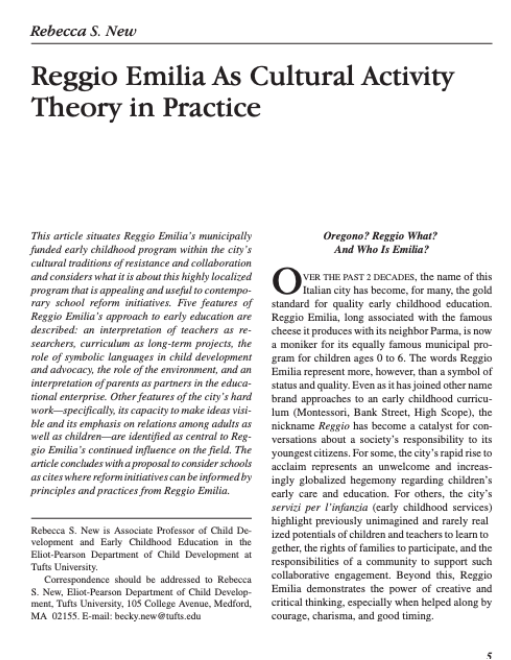 I found this article, to be helpful and the subtitle, “Oregono? Reggio What? And Who is Emilia?” is amusing and thought-provoking. Written by Rebecca New (2007) it looks at the epistemological origins of the approach so that we can ponder “how such highly particularized ideas could grow and develop in one setting and then be dispersed around the world where they have taken root and flourished in diverse but hospitable soils” (p. 6).