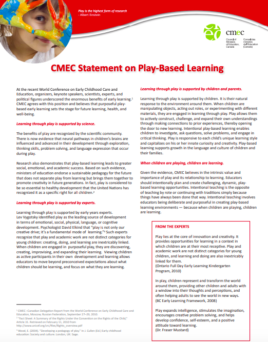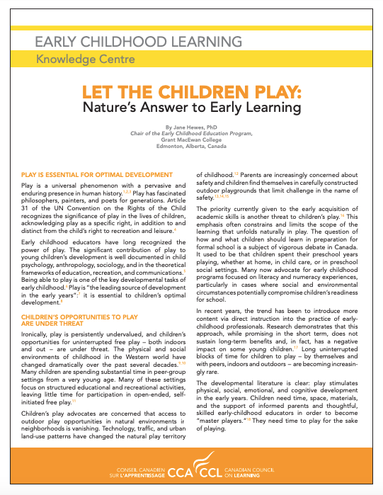 Another resource that supports play-based learning comes from the Canadian Public Health Association (CPHA, 2018). The CPHA laments that children’s access to unstructured play is increasingly limited and calls upon us to improve children’s access to unstructured play as a source of learning and in support of development.