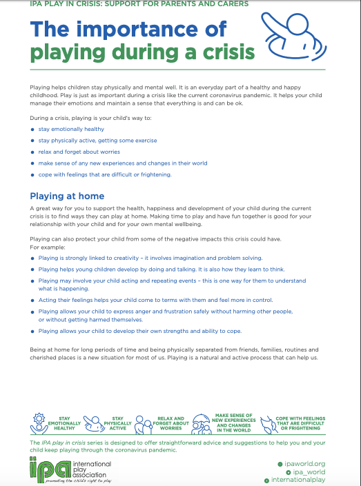 The final resource that I am sharing was shared with me recently. It speaks to the importance of play in this time of crisis. Children learn through play. So let children play especially now!